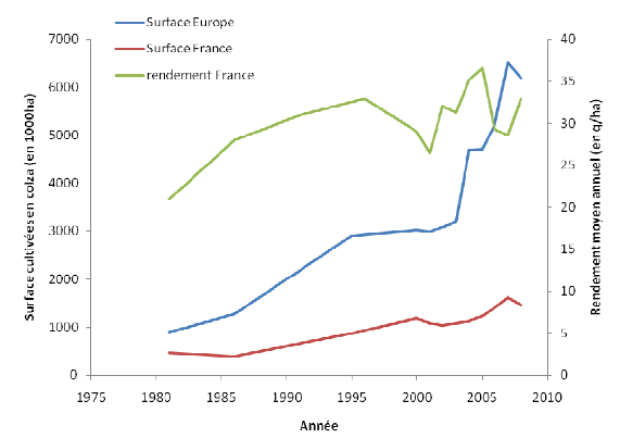 Le colza est une plante annuelle dont les fruits (les siliques) renferment de petites graines riches en lipides. Après extraction de l'huile, les résidus riches en protéines sont transformés en tourteaux et utilisés pour l'alimentation animale. Le colza oléagineux a un débouché dans la production de biocarburants. La production d'huile est réalisée à partir de variétés d'hiver, qui sont les plus cultivées 1. Le colza d’hiver (Brassica napus L.) est une culture en pleine expansion qui connaît une augmentation importante de ses surfaces depuis une dizaine d’années en France et en Europe (cf. galerie). Cette augmentation est due au fait que cette culture présente de nombreux intérêts, d’abord économiques puisqu’il existe de nombreux débouchés pour valoriser la culture, mais aussi en raison de véritables atouts agronomiques et environnementaux. Le colza a de bonnes capacités d’absorption de l’azote et ce dès l’automne, ce qui permet de valoriser les apports d’amendements organiques et de limiter la lixiviation de l’azote 2. Son système racinaire en pivot permet de maintenir un bon état structural du sol, ce qui est particulièrement dans les systèmes en non-labour ou en travail du sol simplifié. De plus, le colza augmente de l’ordre de 10% le rendement du blé suivant dans la rotation 3. Ainsi, l’insertion de colza dans les rotations permet une gestion plus aisée des adventices. Plus particulièrement, l’apparition d’adventices résistantes aux herbicides est limitée par l’emploi sur colza de matières actives différentes qui atténuent la pression de sélection au cours de la succession culturale. D’autre part, par sa capacité d’étouffement et son occupation du sol importante, de septembre à juin, le colza freine le développement des mauvaises herbes et limite les problèmes d’érosion. L’insertion du colza dans les rotations limite également le développement des maladies sur céréales de par son effet « coupure » et par la décomposition des résidus de colza qui possèdent alors des propriétés biocides contre de nombreux pathogènes comme des champignons, bactéries ou nématodes.