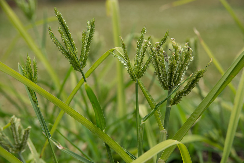 Eleusine coracana, l'éleusine, est une espèce de plantes monocotylédones de la famille des Poaceae, originaire d'Afrique. C'est une plante herbacée annuelle cultivée comme céréale secondaire pour ses graines comestibles. Elle est l'objet d'une culture vivrière en Afrique centrale et orientale.1 C’est une plante érigée, de 60cm à plus de 150cm de haut, mais pouvant verser ou être prostrée. Les tiges sont aplaties latéralement. Les feuilles, au vert brillant caractéristique sont très résistantes. Eleusine coracana produit un grand nombre de talles (variable selon les variétés), et des ramifications peuvent se faire au niveau des noeuds. La verse est assez fréquente. Les inflorescences sont digitées, avec 4 à 6 doigts pour la plupart (plus rarement, 2 à 8) de 12 à 15 cm de long, droits ou légèrement incurvés. Les épillets sont alternés sur le rachis, chacun contenant 4 à 7 graines de 1 à 2 mm. Leur couleur peut varier du brun foncé avec des tons rouges ou orangés, à presque blanc. Le poids de mille grains est d’environ 2,5 g. Une particularité marquante d’Eleusine coracana est son système racinaire fasciculé, fibreux, exceptionnellement puissant. Eleusine coracana est ainsi très difficile à arracher.2