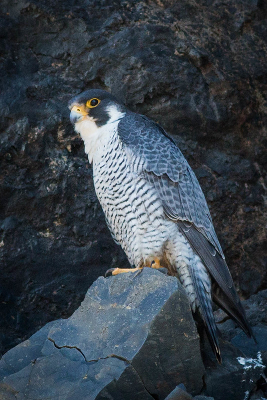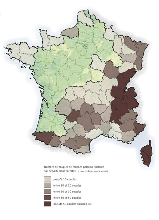 Le Faucon possède une tête ronde, assez volumineuse par rapport au corps, paraît relativement plus petite chez la femelle que chez le mâle. Elle est noire chez l'adulte, brun plus ou moins sombre ou roussâtre chez les jeunes de moins de 1 an. Les joues sont marquées d'une large tache noire en forme de "favoris" appelée moustache. La tête noire et les larges moustaches donnent l'impression que l'oiseau est casqué. Le bec est courbe, court et pourvu d'une denticulation à la mandibule supérieure qu'on observe chez tous les faucons. Cette sorte de "dent" permettrait aux faucons de tuer plus facilement leur proie en coupant les ligaments des cervicales et la moelle épinière, lorsqu'ils la mordent au niveau du cou après la capture. Le plumage des deux sexes est sensiblement le même. Cependant, le mâle est souvent plus clair et bleuté que la femelle dont les couleurs tendent vers le gris-anthracite plus ou moins teinté de brun. Chez la femelle, le contraste clair à la base de la queue est moins marqué que chez le tiercelet. Les parties inférieures sont chamois, ponctuées de "larmes" marron chez les jeunes, blanc à blanc roussâtre et barrées transversalement de noir chez les adultes. Le mâle, plus souvent que la femelle, a la gorge blanche uniforme ou peu marquée, alors que celle de la femelle est généralement parsemée de grosses taches noires. À distance, le mâle paraît donc plus contrasté - blanc et gris - sur les parties inférieures, au contraire de la femelle qui paraît de teinte plus uniforme, claire ou roussâtre, mais fréquemment plus roussâtre que le mâle. Le dos est d'un brun plutôt uniforme chez les jeunes, gris chez les adultes. Le juvénile à l'envol a les tectrices supérieures ourlées de chamois. La cire du bec, le tour de l'œil et les pattes sont jaune-maïs chez les adultes. Chez les jeunes, les deux premiers sont bleutés. Les pattes sont bleutées ou jaune verdâtre, passant au jaune terne au cours des mois qui suivent l'envol.1