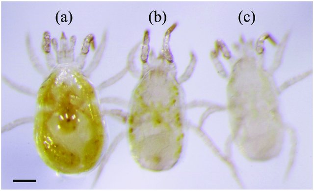 Cet acarien prédateur a la forme d'une poire , il est de couleur jaune brillant et mesure 0,5 mm. Son tube digestif se colore de rouge après consommation d'acariens rouges du pommier.