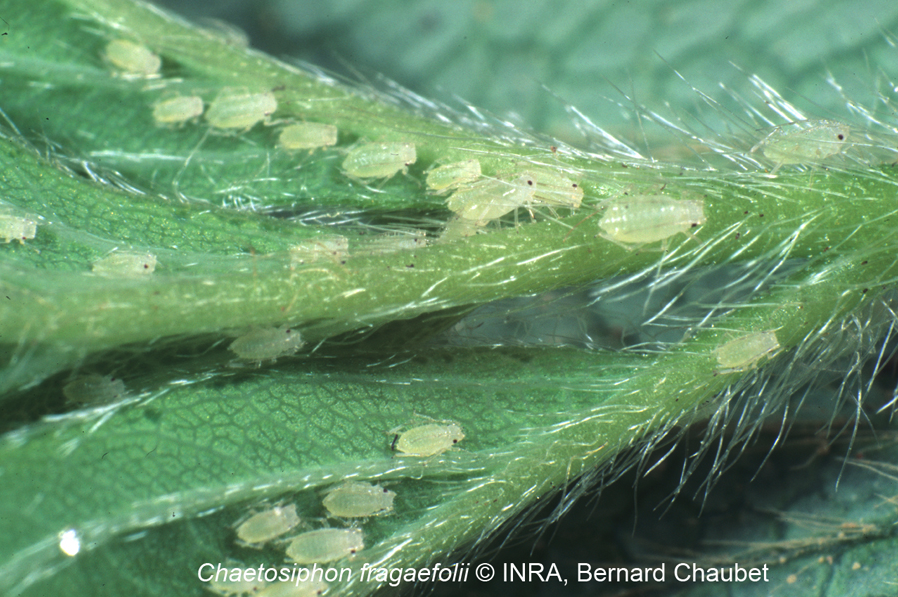 HIVER : Les virginipares aptères hivernent sur les fraisiers.