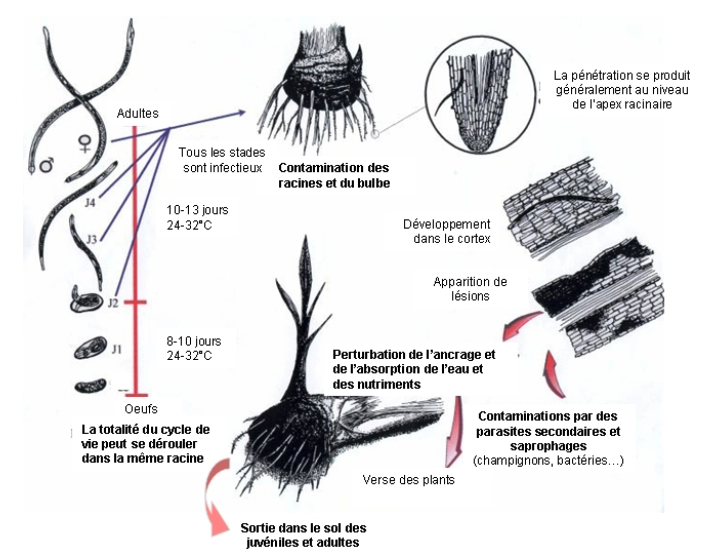 Les oeufs éclosent au bout de 2 à 6 jours et les stades juvéniles se succèdent en 10 à 15 jours. La durée de vie de ce nématode est d'une vingtaine de jours.1