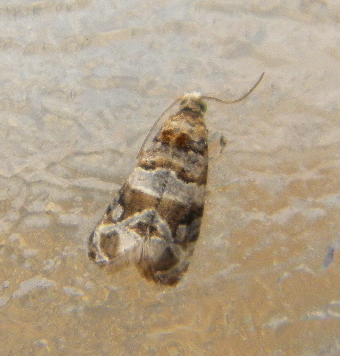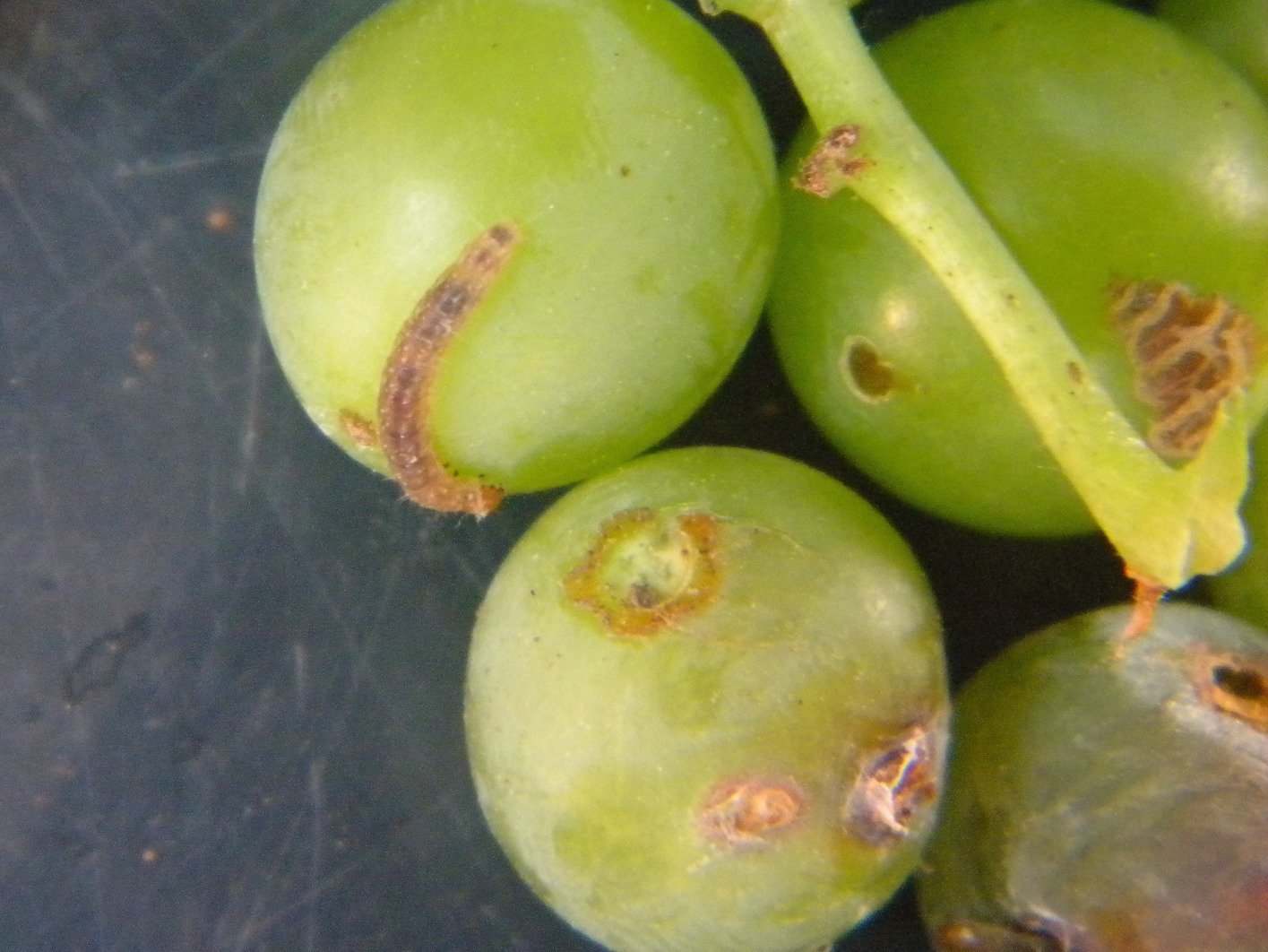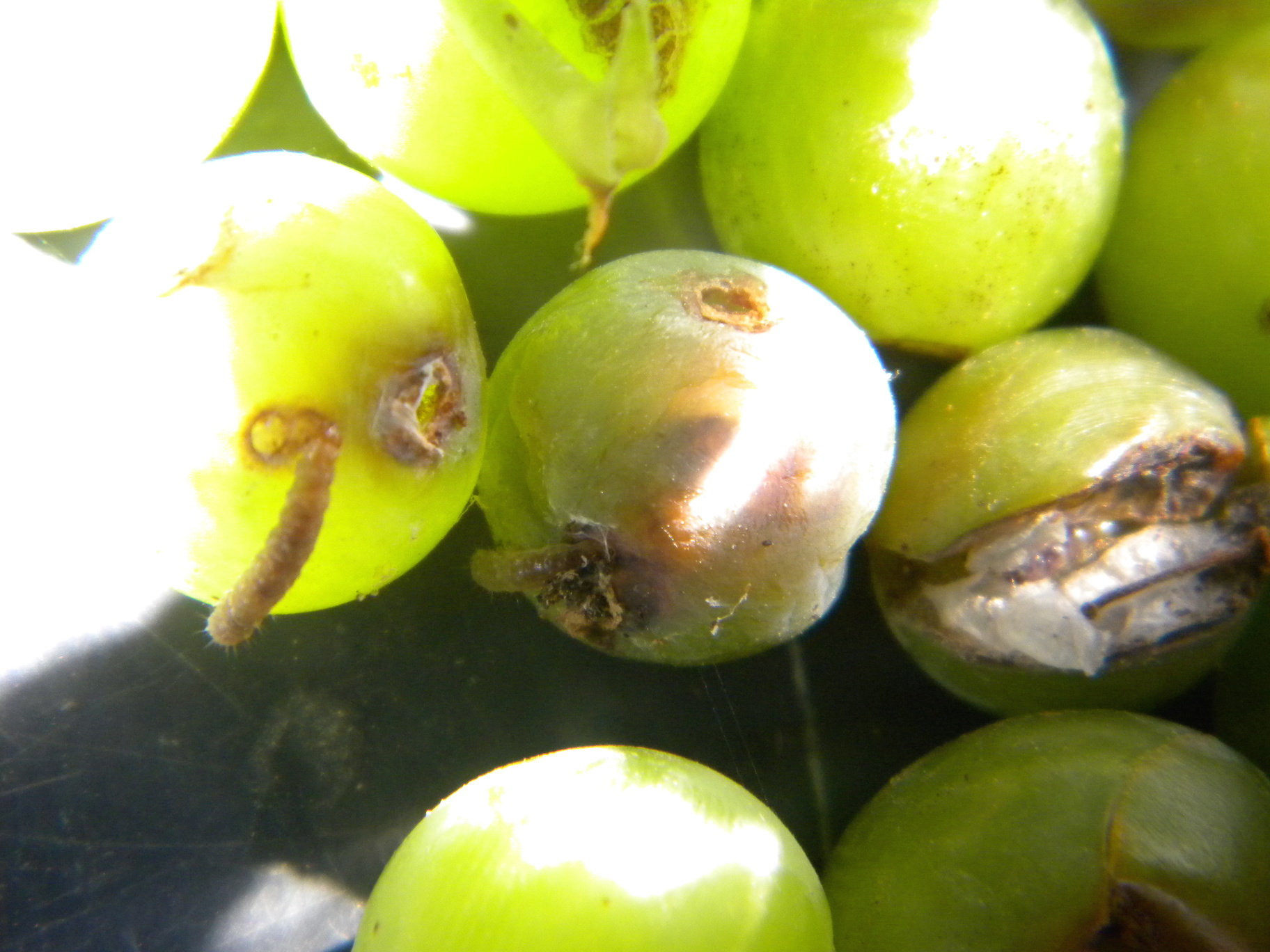 L'adulte présente des ailes antérieures gris bleuté, marbrées de taches brunes plus foncées. Comme chez toutes les tordeuses, le dimorphisme sexuel entre les adultes est assez peu marqué. Toutefois, on les distingue en observant l’extrémité de l'abdomen sur la face ventrale. 1 Les œufs, de forme lenticulaire, sont pondus isolément. Ils sont collés sur les bractées des inflorescences ou sur les baies. D'abord translucide, puis brillant, jaune, les ocelles deviennent visibles vers le troisième jour. Environ deux jours avant l'éclosion, on voit la capsule céphalique, le fameux stade tête noire. 1 2