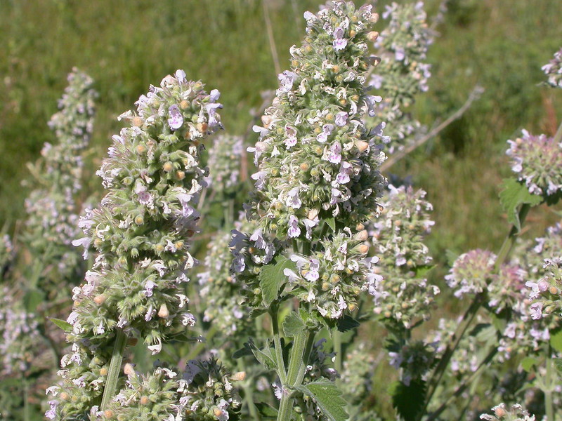 - Plante vivace de 40 cm à 1 mètre, grisâtre, odorante - tige rameuse, densément pubescente - feuilles étalées, toutes pétiolées, ovales en coeur, fortement crénelées-dentées, blanchâtres-tomenteuses en dessous - fleurs blanches ponctuées de rouge, en verticilles multiflores serrés formant une grappe assez courte obtuse interrompue à la base - bractéoles plus courtes que le calice - calice velu, ovoïde, presque droit, à dents lancéolées en alêne - corolle velue, dépassant de 3-4 mm la gorge du calice, à tube inclus, brusquement dilaté à la gorge.1