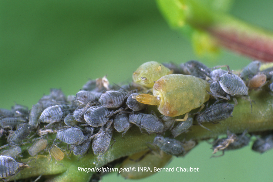 En Europe, les œufs d'hiver, issu de la reproduction sexuée, sont pondus sur le merisier à grappes (Prunus padus, hôte primaire). La rareté de l'hôte primaire dans les régions à céréaliculture intensive entraîne le plus souvent l'anholocyclie. Plusieurs générations par an HIVER : Ils éclosent à la fin de l'hiver et donnent naissance à des générations de fondatrigènes virginipares aptères. Les individus ailés apparaissent ensuite et vont coloniser d'autres Graminées, s'installant d'abord sur le limbe des feuilles supérieures puis se développant sur les épis dès leur sortie PRINTEMPS : Les œufs eclosent à la fin de l'hiver . Les individus ailés apparaissent ensuite et vont coloniser d'autres Graminées, s'installant d'abord sur le limbe des feuilles supérieures puis se développant sur les épis dès leur sortie. ÉTÉ : Lorsque les populations sont abondantes ou lorsque les grains atteignent le stade pâteux, des individus ailés apparaissent en quelques jours, quittent la culture et créent de nouvelles colonies sur des Graminées encore vertes (comme le maïs) AUTOMNE : Une partie de la population évolue en sexupares qui engendrent des sexués dont les femelles pondent les oeufs d'hiver. Les oeufs d'hiver sont pondus sur les chaumes des Graminées.