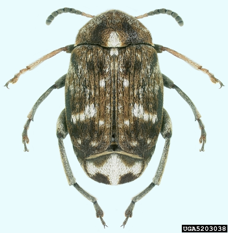 -Les adultes sont des petits coléoptères de 4 à 4,5 mm avec des élytres bruns parsemés de taches blanchâtres et roussâtres. "Son pygidium est blanchâtre avec 2 grandes taches noires, son fémur postérieur a une denticule sur le bord interne parallèle avec une forte dent sur le bord externe." - Les oeufs sont longs, jaunes vifs et long de 0,6mm. - La larve primaire est étroite avec des pattes et mesure 1,2 mm de long. La larve secondaire atteint 5 à 6 mm de long; elle est légèrement incurvée et apode.Sa tête est brune et son corps blanc jaunâtre. 1 Cycle Biologique