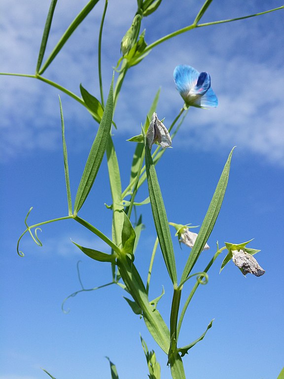 - 30-60 cm, glabre - tiges et pétioles étroitement ailés - vrilles rameuses - stipules lancéolées, plus courtes que le pétiole - fleurs blanches, rosées ou bleuâtres, grandes (15 mm), solitaires sur des pédoncules plus longs que le pétiole et plus courts que la feuille - calice à dents bien plus longues que le tube - corolle 2 fois plus longue que le calice - enracinement pivotant