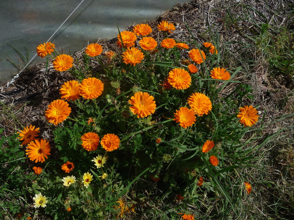C. Gibert, Solagro. Plant de souci officinal (Calendula officinalis) à proximité d'une serre maraîchère dans le Lauragais (31).
