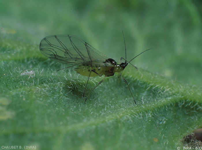 PRINTEMPS : A l'éclosion, les œufs donnent lieu à des fondatrices. On trouve ensuite, durant une longue période, des femelles vivipares au sein des colonies. Puis, les jeunes larves se forment. Elles se nourrissent de sève et muent 4 fois avant de donner naissance à l'adulte sans ailes : aptères. Chaque individu peut donner naissance à 30 à 50 descendants en fonction de l'hôte et des conditions climatiques notamment, et certains adultes seront ailés, qui iront colonisés les champs à proximité. Les populations s'accroissent très rapidement dès le début du printemps. Dans des conditions favorables, elles peuvent doubler en deux jours. Les femelles sont virginipares (elles sont parthénogénétiques, tout comme leur descendance). Les larves et les adultes, souvent présents à la face inférieure du limbe, se nourrissent grâce à leur rostre. Le sucre en excès contenu dans la sève est rejeté sous la forme de miellat. Les pucerons se dispersent depuis leur foyer dans la culture et les parcelles alentours. 2