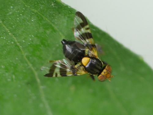 L'adulte est une petite mouche de 3,5 à 5 mm de long. Son corps est noir taché de jaune sur le thorax et la tête. Elle possède des ailes transparentes avec 4 bandes bleues noires. L'asticot blanchâtre mesure 4 à 6 mm de long.1