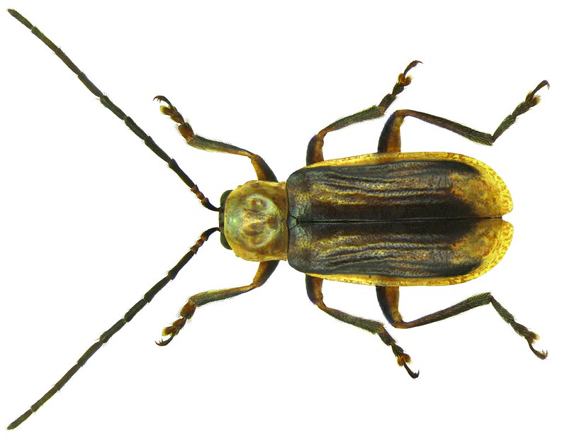 L'adulte mesure 5-6 mm de long et est reconnaissable à ses antennes très rapprochées et es deux lignes noires longitudinales sur fond jaune au niveau des élytres.1