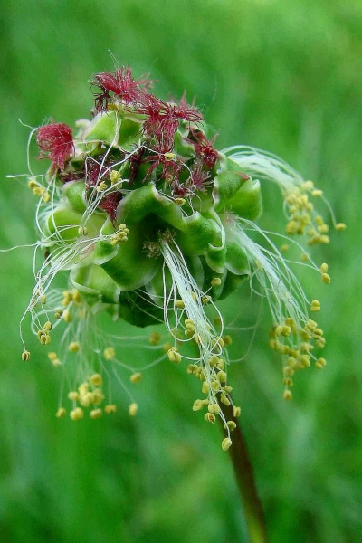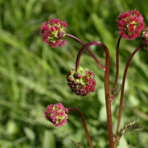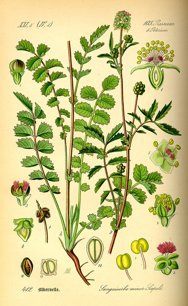 Ex Sanguisorba minor. La petite primprenelle est une plante de 20 à 50 cm de hauteur, et se reconnaît à ses inflorescences globuleuses d'environ 1 cm. Les fleurs du bas sont mâles, à étamines nombreuses et très longues. Les fleurs supérieures sont femelles à stigmates rouges. Entre les deux on trouve souvent un certain nombre de fleurs hermaphrodites dont les quatre étamines ne dépassent pas le calice. Les sépales sont verts ou rougeâtres.1