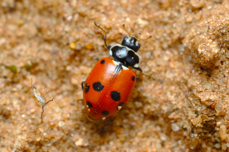 Sur les élytres rouges souvent trois points noirs qui peuvent être plus nombreux ou fusionner. Pronotum nettement rebordé à la base avec un liseré blanc sur les bords antérieur et latéraux et quelque fois deux taches blanches. L'espèce se trouve sur strate basse à arbustive. Elle est polyvoltine et s'observe dans les milieux thermophiles de Mars à Octobre.1 Elle a une grande voracité sur les pucerons : au stade adulte elle peut consommer en moyenne entre 140 et 160 larves d'Aphis gossypii par jour.2 Cycle Biologique