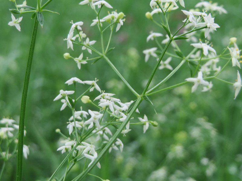 Plante vivace, dépassant souvent 1 mètre, glabre ou pubescente, verte, ne noircissant pas. Tiges décombantes ou ascendantes, quadrangulaires, lisses, renflées aux nœuds. Feuilles verticillées par 6-8, assez courtes, obovales ou oblongues, mucronées, minces, veinées, à nervure dorsale peu saillante. Fleurs d'un blanc sale, petites (3 mm), très nombreuses, en panicule très ample, lâche, à rameaux étalés ou déjetés,pédicelles fructifères divariqués ,corolle à lobes aristés. Risque de confusion avec : Galium aparine 34