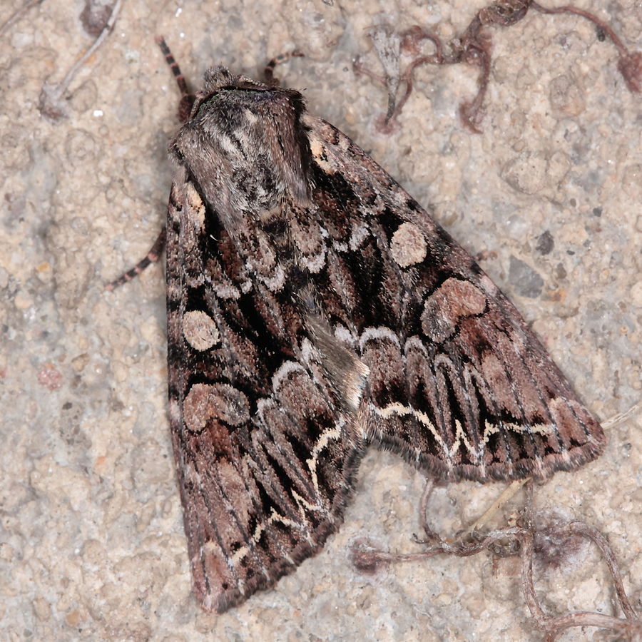 Adultes : ailes antérieures gris-marron à noires et ont entre 40 et 50 mm d’envergure, avec, au milieu un dessin réniforme bordé de taches blanches. Les ailes postérieures marron clair présentent une tache assez distincte au milieu. La tête et le thorax sont brun gris tacheté de blanc et l’abdomen est marron grisâtre pâle.