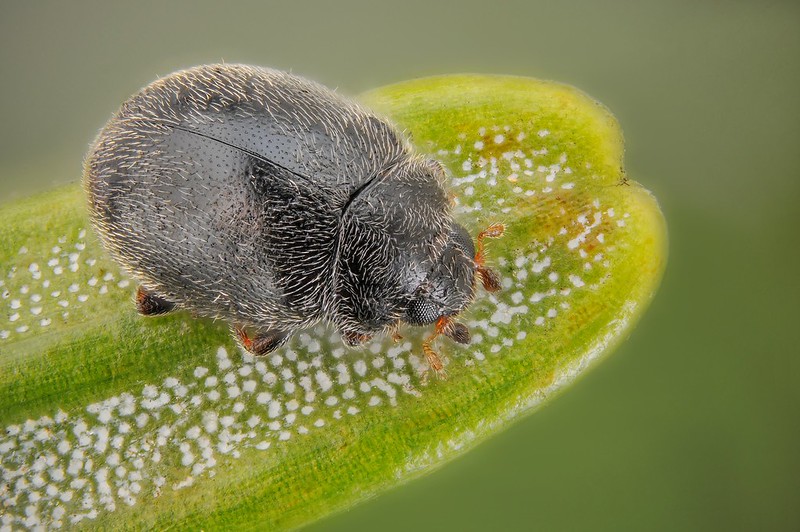 Adultes: Les coccinelles du genre Scymnus sont petites, 3 mm en moyenne, poilues, et leurs couleurs sont très variables. Elles peuvent être entièrement noires avec l'extrémité des élytres rougeâtres, brunes, etc. Elles chutent généralement dès qu'elles sont dérangées.1