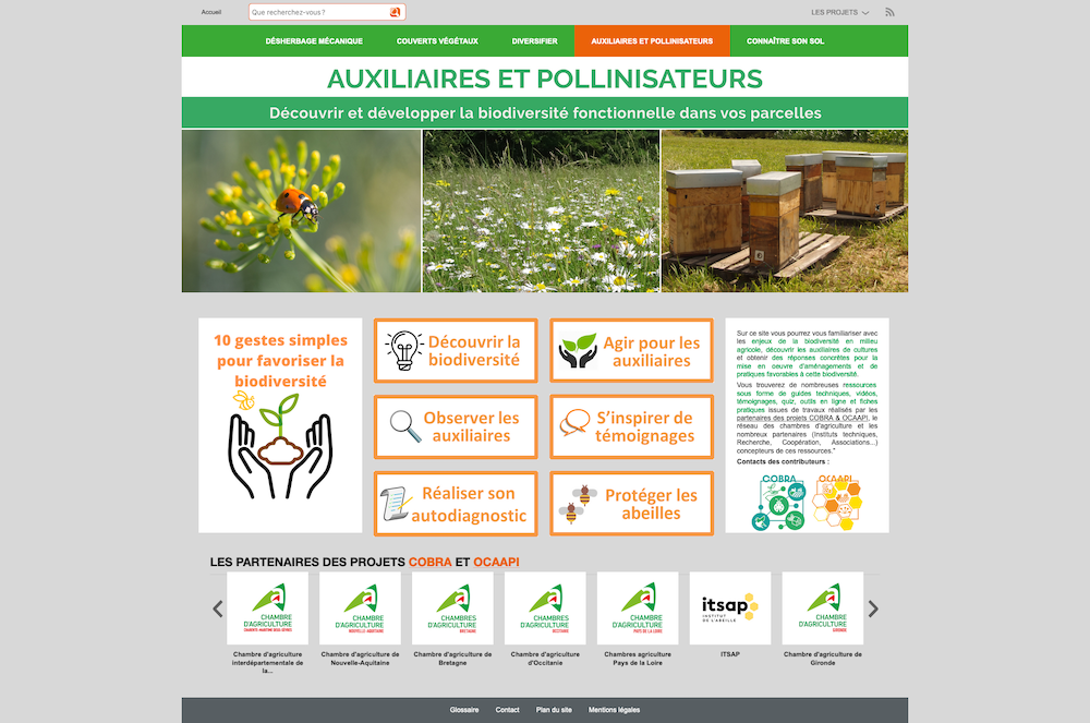 Découvrez le site web « Auxiliaires et pollinisateurs », construit dans le cadre des projets REFLEX COBRA, Concevoir des Outils Biodiversité pour Renforcer l’accompagnement et la formation des Agriculteurs, et OCAAPI, Outils de Conseil Agricole en faveur des abeilles et de l’APIculture, pilotés par la Chambre régionale d’agriculture Nouvelle-Aquitaine.