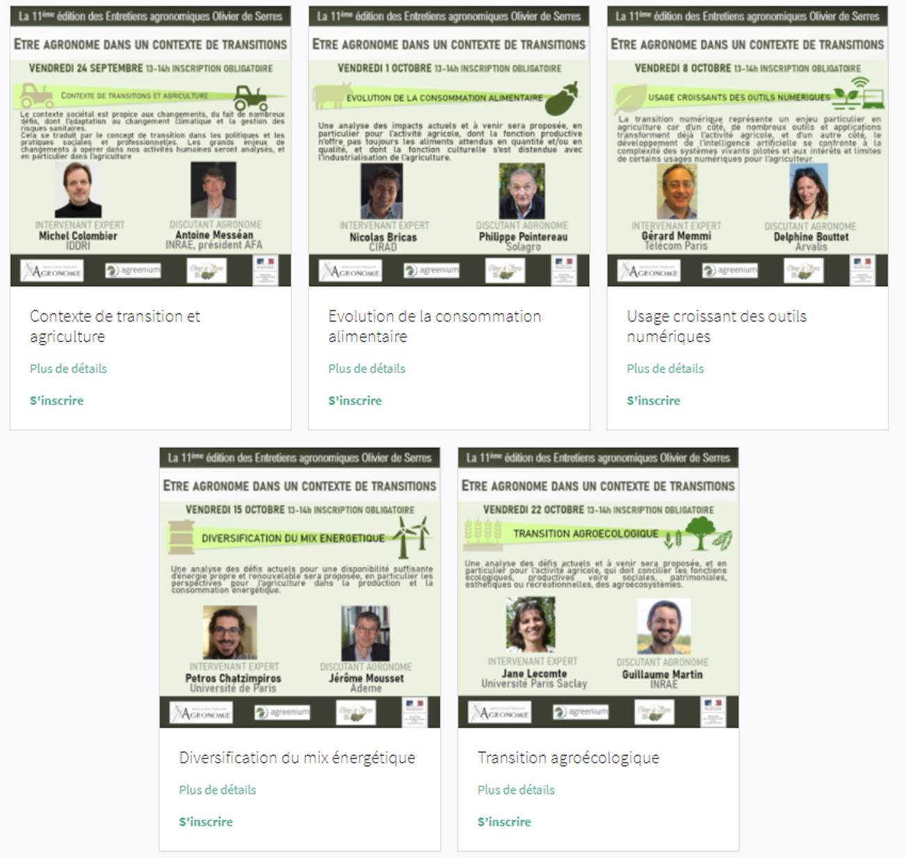 L’Association français d’agronomie et l’Alliance Agreenium proposent, pour sa nouvelle édition des Entretiens agronomiques Olivier de Serres, une première étape de l’évènement sous forme d’un cycle de 5 wébinaires, où un intervenant expert et un discutant agronome poseront les enjeux des différentes transitions (globale, alimentaire, énergétique, numérique, écologique), leur impact dans les pratiques agricoles et les conséquences pour les agronomes.